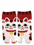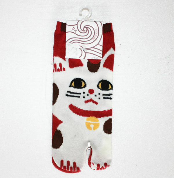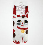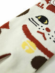 Japanese traditional tabi style socks. Japan import, made in Japan. Manekineko design. Beckoning Cat, Figure of a cat with one paw raised. Manekineko brings someone good luck. If right hand is raised, it will bring Money. If left hand is raised, it will bring friends/customers. 24cm for Women's 23-25cm(5.5-7.5). Short Length: 19cm(7.5"). Perfect for Kimono, Yukata, Geta/Zori sandals as well as casual/home use.